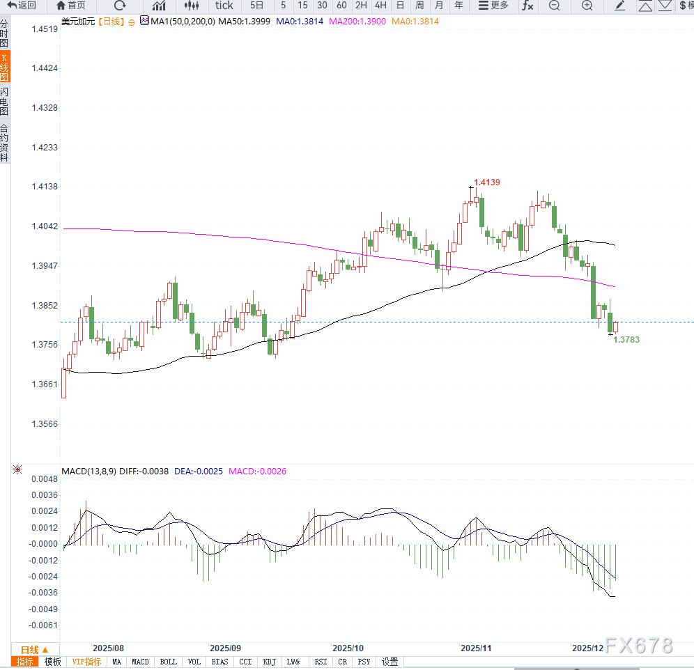 美元兑加币维持1.3800附近弱势格局,整体呈现空头控盘迹象。K线持续在五日均线下方运行,显示反弹动能有限。MACD保持死叉状态,空头能量柱扩大;RSI徘徊在中性偏弱区域,未出现超卖,意味着仍有进一步下探空间。