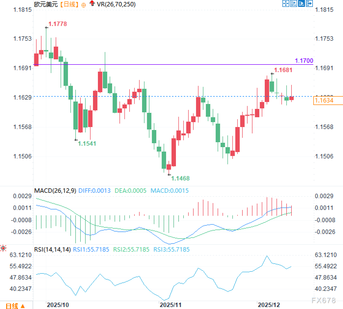上方关键阻力位于1.1700整数关口,自10月中旬以来多次对汇价形成压制,属于中期强阻力区域。更上方阻力参考前期高点1.1778,若能有效突破1.1700,则有望打开上行空间。近期反弹高点1.1681同样构成短期阻力,汇价需先克服此处压力方能向1.1700发起冲击。