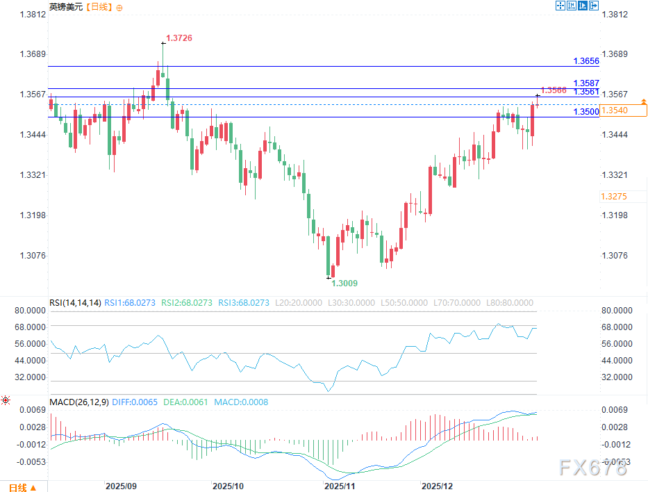从技术层面分析,英镑/美元已突破1.3500美元这一重要整数关口,且当前站稳于该关口上方——这是趋势延续行情中的典型看涨信号。1.3561美元阻力位是今日的关键多空分水岭,若汇价能有效突破该价位,大概率将进一步上探1.3587美元阻力位,甚至可能触发一波快速拉升,直指下一道阻力位1.3656美元。